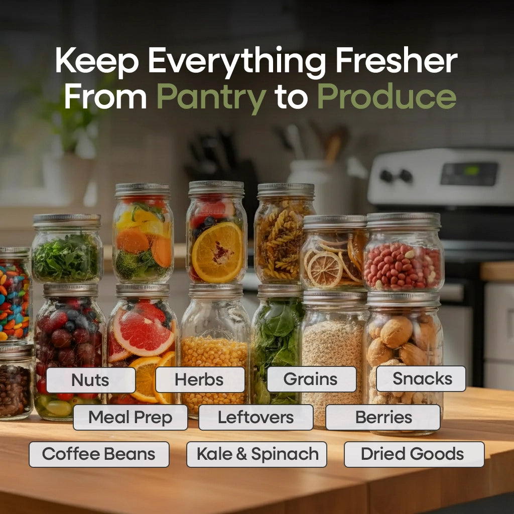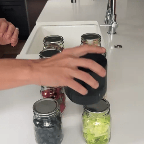 Strawberries that still smell sweet on day 8. Seal your berries and salads in jars and they last a full week longer. Which means you actually eat what you paid for.
